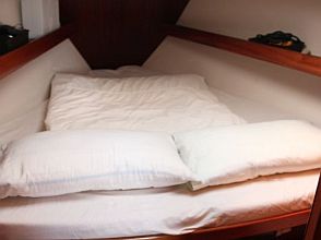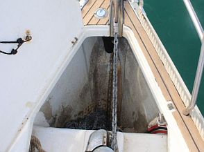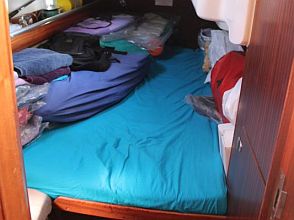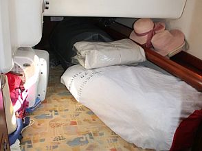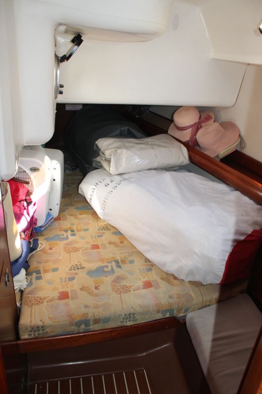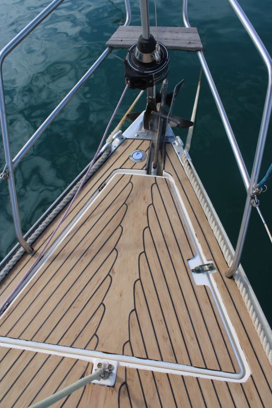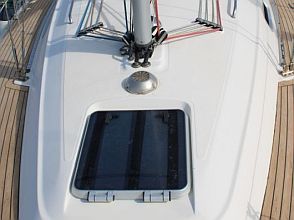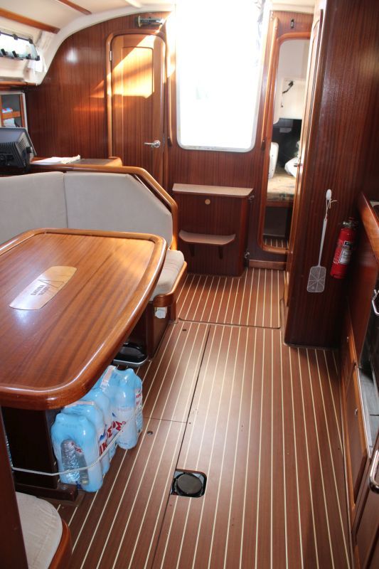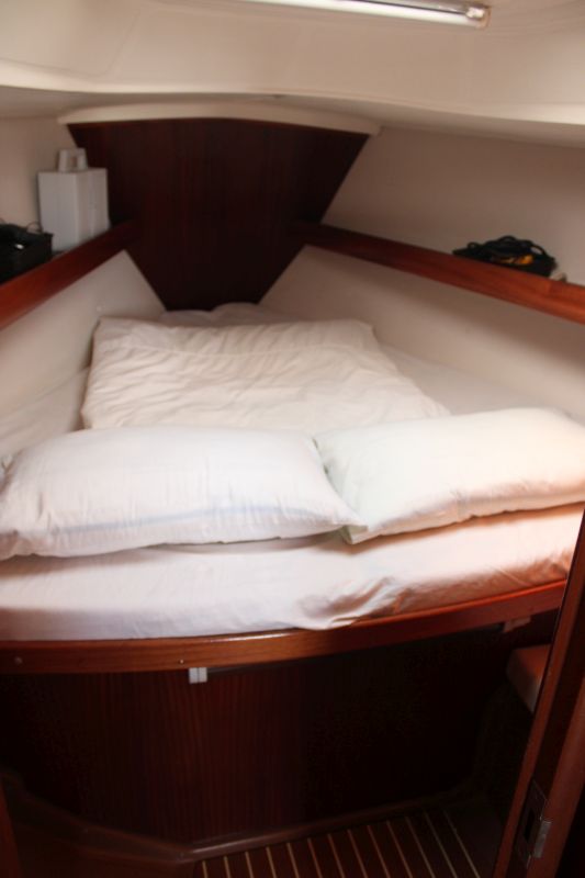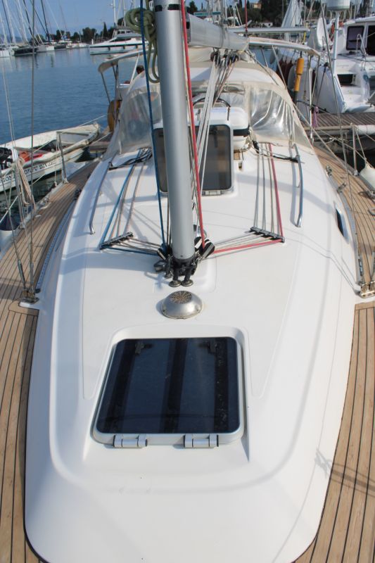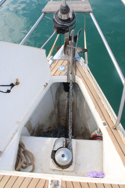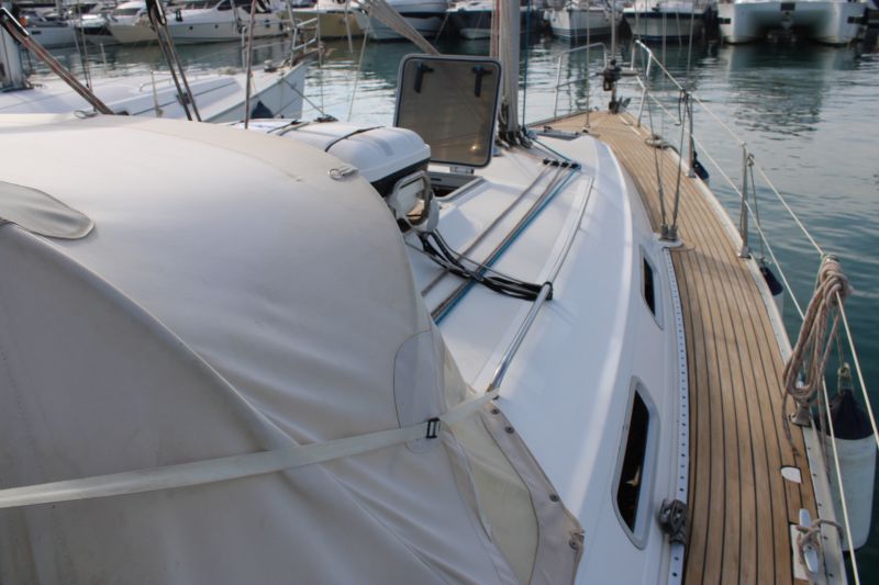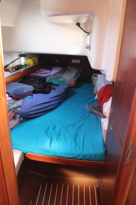 Boarding this Bavaria 36 from the sugar-scoop, you pass through the transom gate into the spacious cockpit. Wheel steering and the position of the propeller / saildrive offer easy vice free handling under engine and she has a good sailing performance with her slab / single line reefing mainsail. Lines are led aft so she is easy to handle short-handed under sail aided by her lazyjack system and sail bag. There is a large anchor locker forward with replacement windlass and plenty of opening hatches / port lights for ventilation.