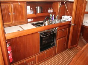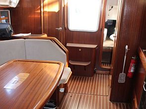 Below decks the well maintained Volvo engine is located under the companionway steps and two double aft cabins with good stowage are accessed either side. The chart table and navigation area is to starboard at the aft end of the saloon with a good sized heads/shower compartment opposite to port. Forward of this is the practical longitudinal galley. There is good stowage and an efficient fridge. Opposite to starboard is ‘U’ shaped seating around the saloon table. Forward of the saloon in the forepeak area is another comfortable double cabin.