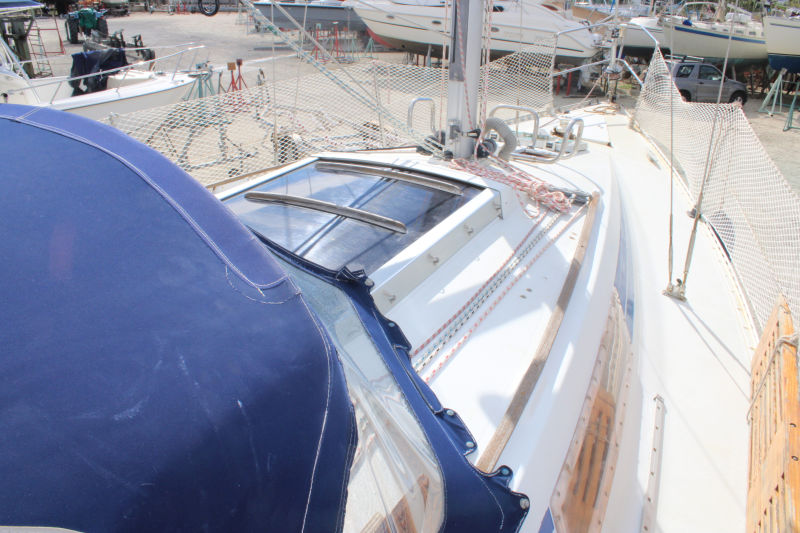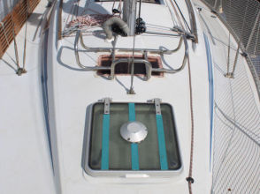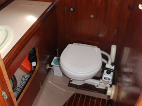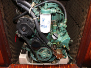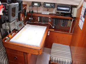Descending the companionway steps a practical galley is located to port with a good sized and extensively equipped chart table and navigation area opposite to starboard. A straight settee is forward of the chart table and opposite across the saloon table there is an ‘L’ shaped settee and both make good sea berths. The forepeak area houses a double cabin with some stowage. The larger double cabin aft to port is accessed behind the galley and has wardrobe and shelf stowage. The reliable Volvo engine is located under the companionway steps and benefits from a comprehensive maintenance program The heads / shower compartment is located to starboard aft of the chart table.