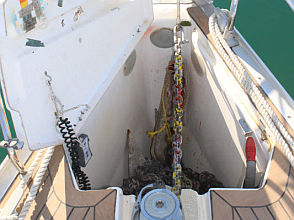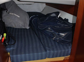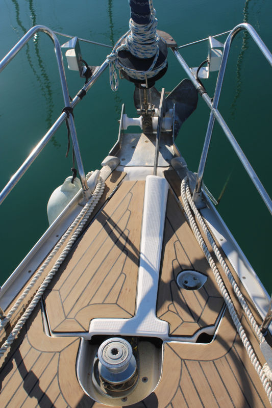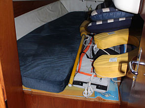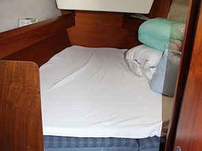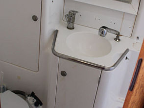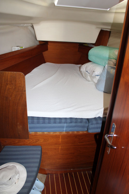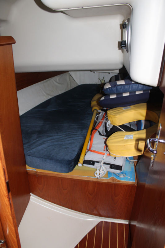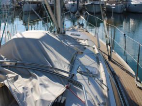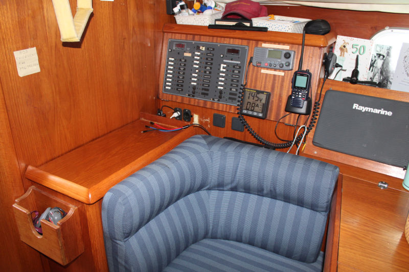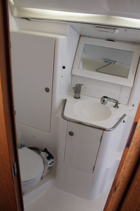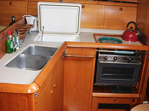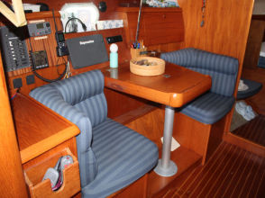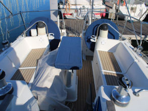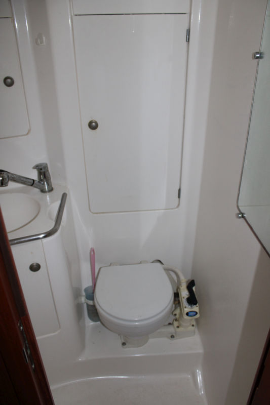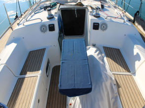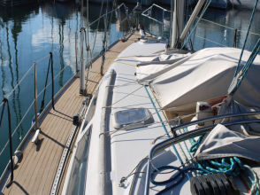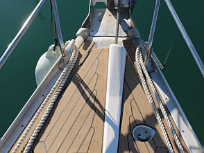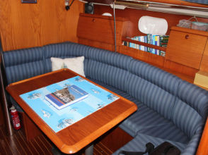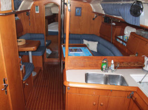Descending the companionway steps with you enter the saloon where a practical galley is located to starboard with an excellent heads (with separate shower stall) located opposite to port. Forward of this are two single seats with a chart table between and a well equipped navigation area. Opposite is U shaped seating surrounding the saloon table. This is a comfortable yacht with a lovely real wood interior giving a pleasing ambience. Many opening hatches offer excellent ventilation and light below decks. The forepeak area houses an owner`s double cabin with an en-suite heads / shower compartment and there are two spacious double guest cabins aft.