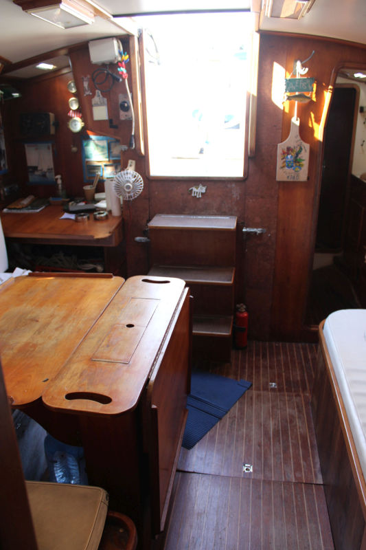 Descending the companionway steps you enter the saloon which has an aft facing chart table and navigation area at the bottom of the steps to starboard with an L shaped seating around the saloon table forward of this. There is a straight settee opposite to port and both can be used as sea berths on passage. The forward end of the saloon has a walk-thru with heads compartment to starboard and stowage opposite to port. Further forward is a double cabin in the forepeak area. There is a walk-thru at the aft end of the saloon to port that houses the galley and gives access to the full width aft cabin and another heads compartment. The engine is located behind the companionway steps.
