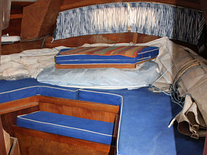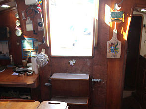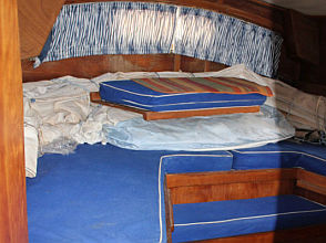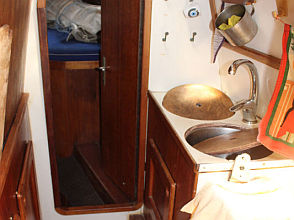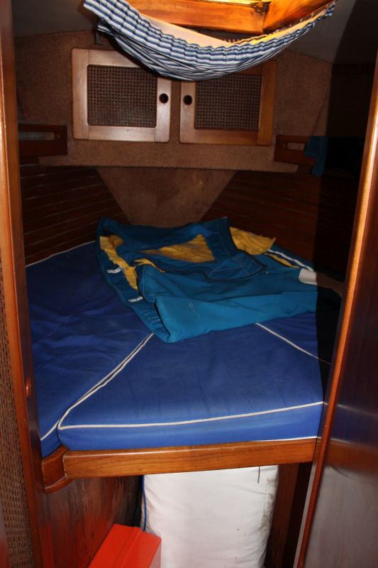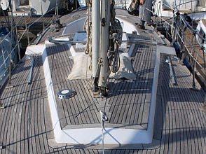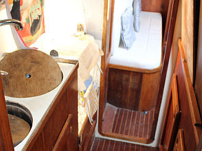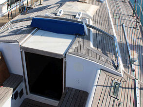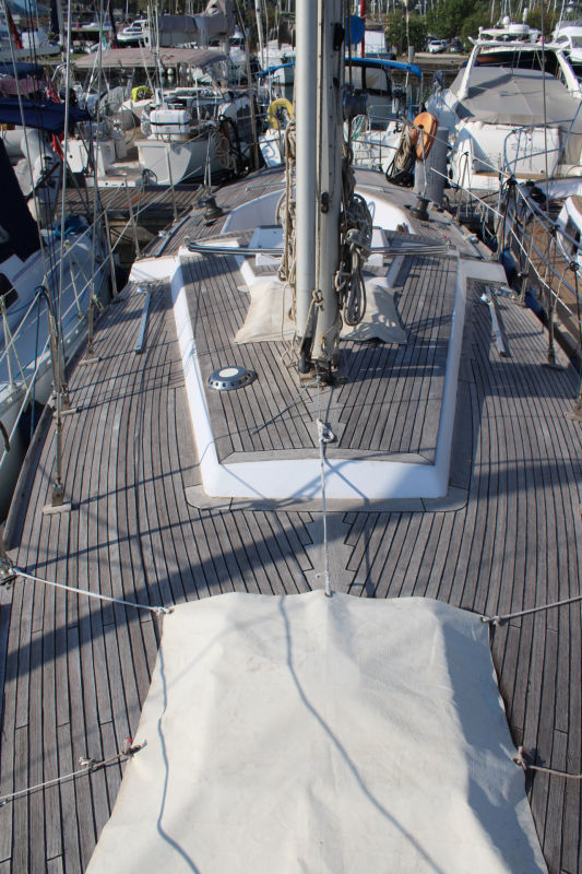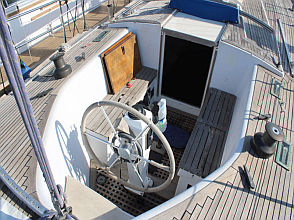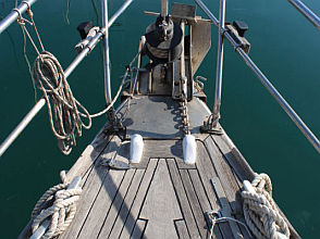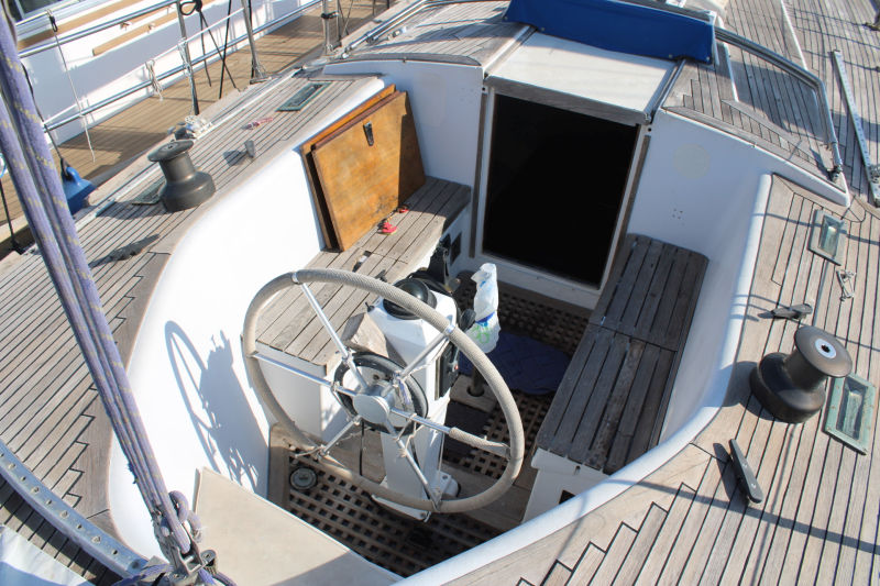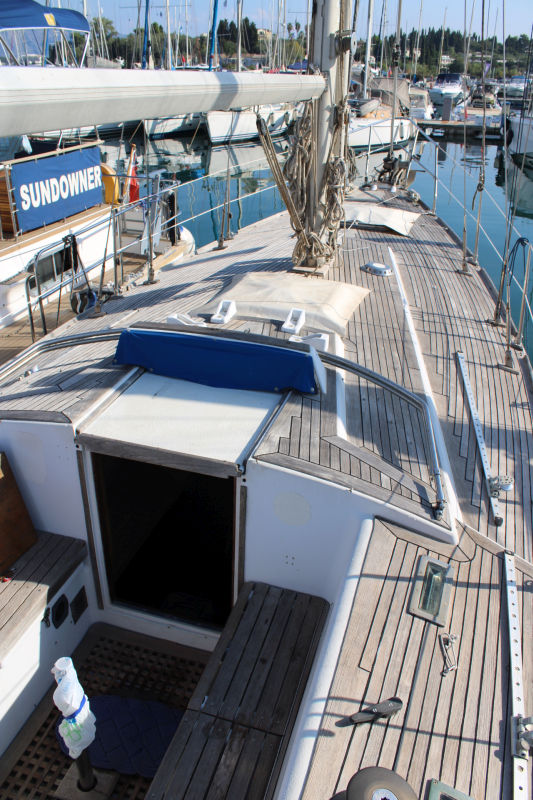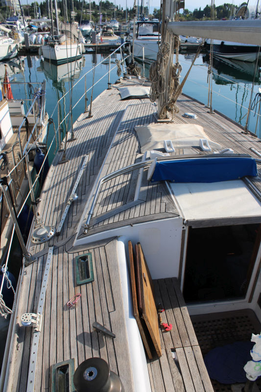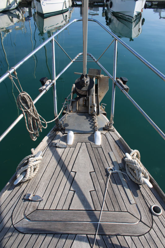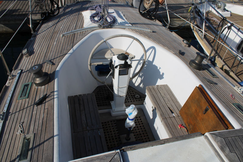 Stepping aboard this Tagudo 34 whilst stern to is from the passerelle to the stainless steel and teak bathing platform. The deep centre cockpit gives a feeling of security at sea and allows for a spacious layout below decks given the overall length of the boat. She has full teak decks complimenting her traditional lines. Wide sidedecks allow easy access forward and the deep anchor locker with electric windlass gives easy anchoring.